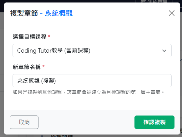 按下章節右方的「複製」按鈕,可直接複製該章節。可將該章節的內容(含圖片及附件)直接複製到其他課程或本課程。如果是複製「章」,會連同底下的「節」一同複製過去。