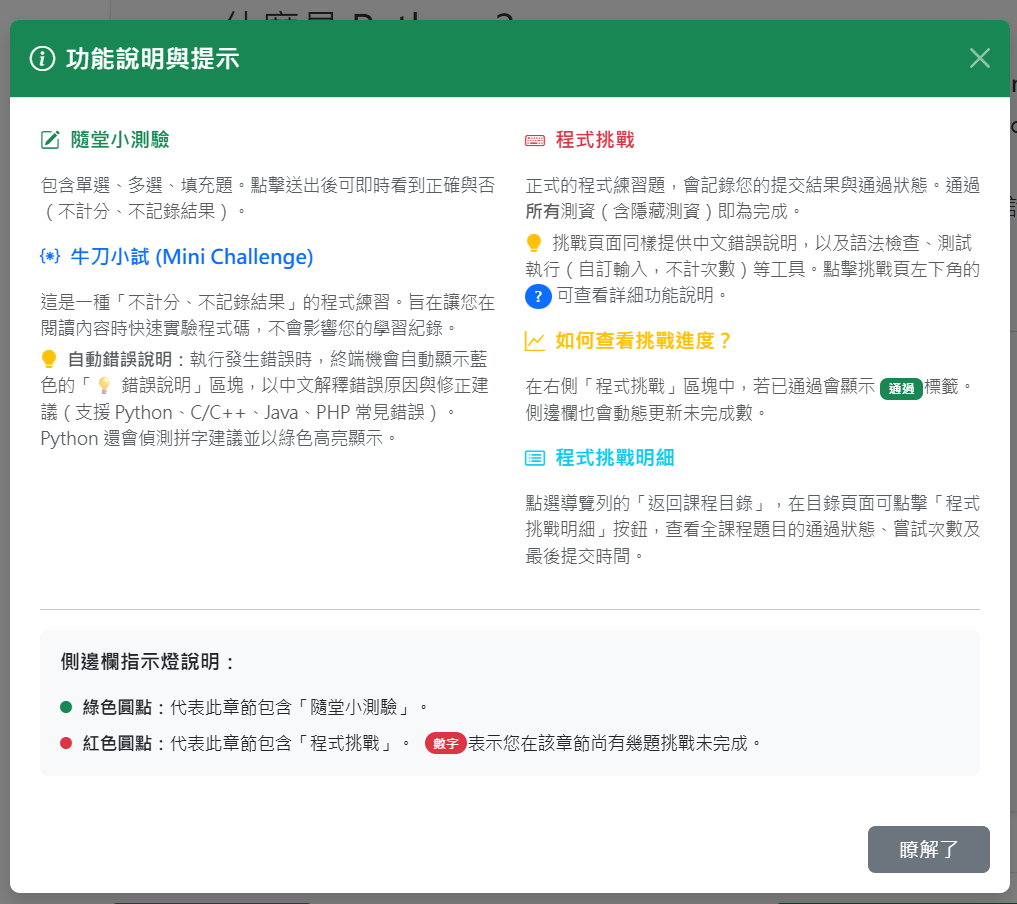 進入課程首頁,左方可看到課程的章節,右邊則會列出目前程式挑戰的明細及挑戰進度,若該課程有測驗,亦會在右側的「課程測驗」中列出。