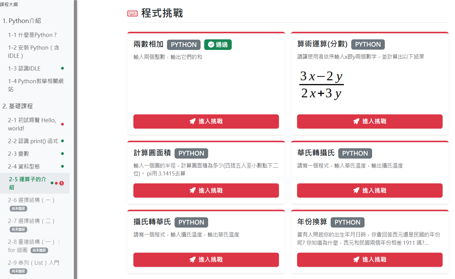 章節列表的右方有紅色圓圈及數字,代表該章節有幾題挑戰題,就是一般常見的「Online Judge」線上解題,按下「進入挑戰」即可開始進行程式的挑戰。