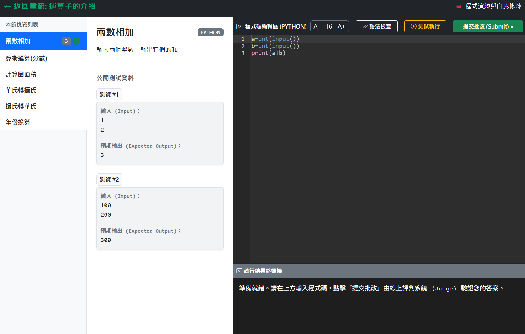 程式的挑戰畫面如下,左側為該章節的挑戰題,中間為題目及測試資料,右邊為程式碼的編輯區,並提供三個功能:
